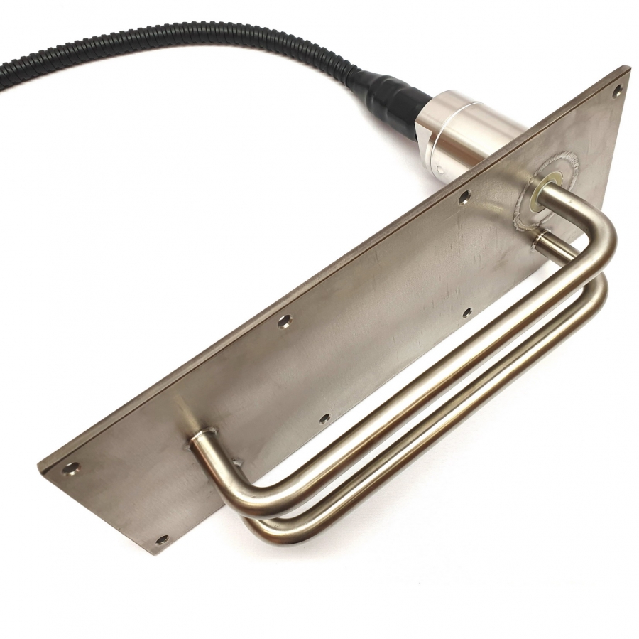 1. Датчики влагомеров FIZEPR-SW100.10.6 и FIZEPR-SW100.10.21 выполнены из нерж. стали 12Х18Н10Т и содержат П-образный зонд, который закреплен на щите. Как видно из приведенных ниже фотографий этих двух датчиков, у датчика влагомера FIZEPR-SW100.10.6 на щите размещен только один П-образный зонд. Контролируемый этим датчиком объем зерна составляет около 10 литров. У датчика влагомера FIZEPR-SW100.10.21, также широко применяемого в зерносушилках, в отличие от варианта FIZEPR-SW100.10.6 вблизи зонда и параллельно ему установлен второй П-образный пруток. Этот второй пруток выполняет функцию экрана и ограничивает (как бы отсекает с одной стороны от зонда) область зондирования. В ряде случаев, когда слой зерна не достаточно высокий, это позволяет повысить точность измерений.